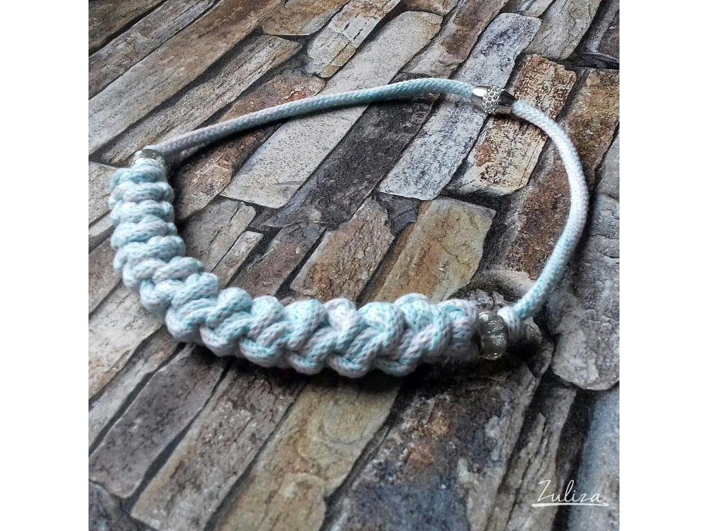 | Materiál: | 100% recyklovaná bavlna, korálek (pryskyřice, bižuterní kov s galvanizací), magnetické zapínání (akrylátové sklo, bižuterní kov s galvanizací, měď). |